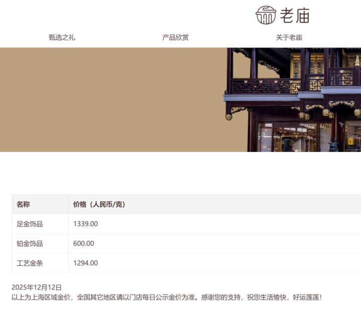 中新经纬查询发现,受此影响,12日,周生生、老庙黄金、老凤祥等国内部分品牌金饰克价也创年内新高。截至发稿,周生生金饰涨至1338元/克,老庙黄金涨至1339元/克,老凤祥金饰涨至1337元/克。